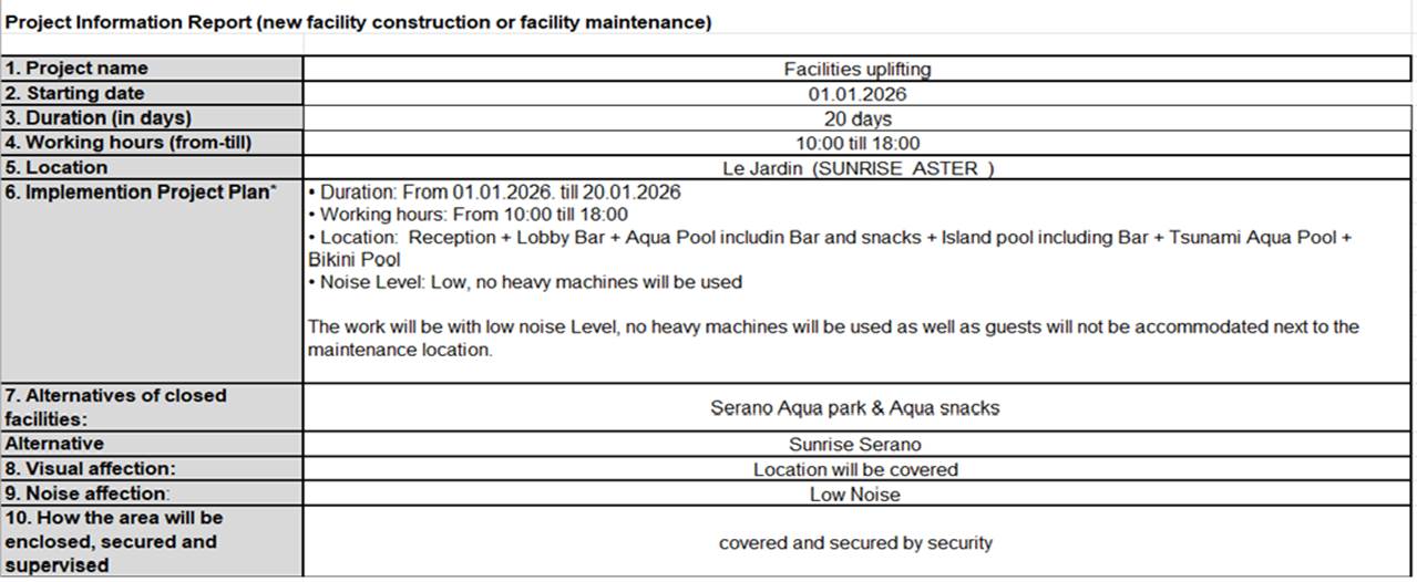 01.01.26 бастап қонақ үй 20 күн бойы келесі тәртіппен жаңғыртудан өтеді.