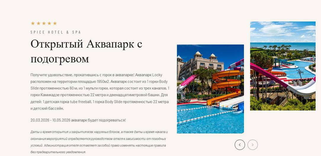 Отель расположен на Анталийском побережье в живописном уголке в окружении сосновых и ореховых лесов. Spice Hotel & SPA обосновался на самом берегу моря и по праву может называться туристическим раем. Отель расположен на шикарном песчаном пляже, протяжённость которого составляет 270 м.