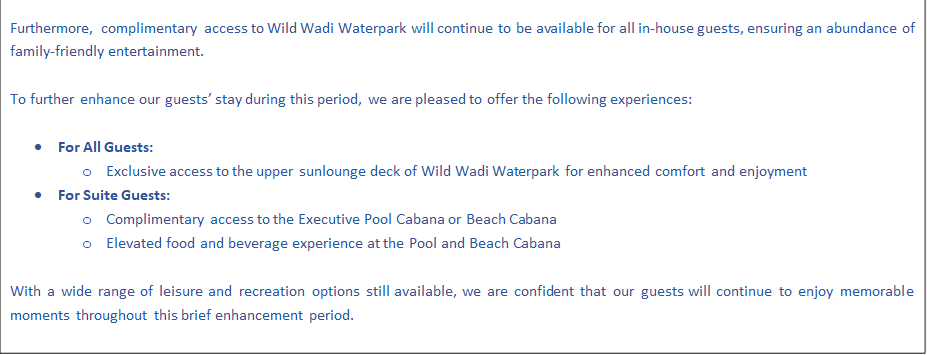 Семейный бассейн временно закрыт до 30 ноября 2025 года, но остальные бассейны (Leisure, Lap, Executive) и частный пляж доступны для гостей. Также все проживающие могут бесплатно посещать Wild Wadi Waterpark. В период работ гостям доступны дополнительные привилегии — включая доступ к верхней террасе в аквапарке, а для гостей люксов — бесплатные кабаны у бассейна или на пляже и улучшенный сервис. Улучшения для гостей на период закрытия.