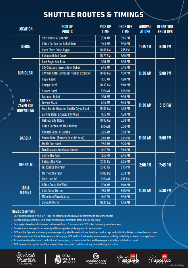 Отдых в Дубае становится ещё комфортнее благодаря бесплатным шаттлам, которые ежедневно курсируют между популярными туристическими зонами и крупнейшими парками развлечений. Если вы планируете посетить Real Madrid World, Motiongate™ Dubai, Legoland® Dubai, and Legoland® Water Park