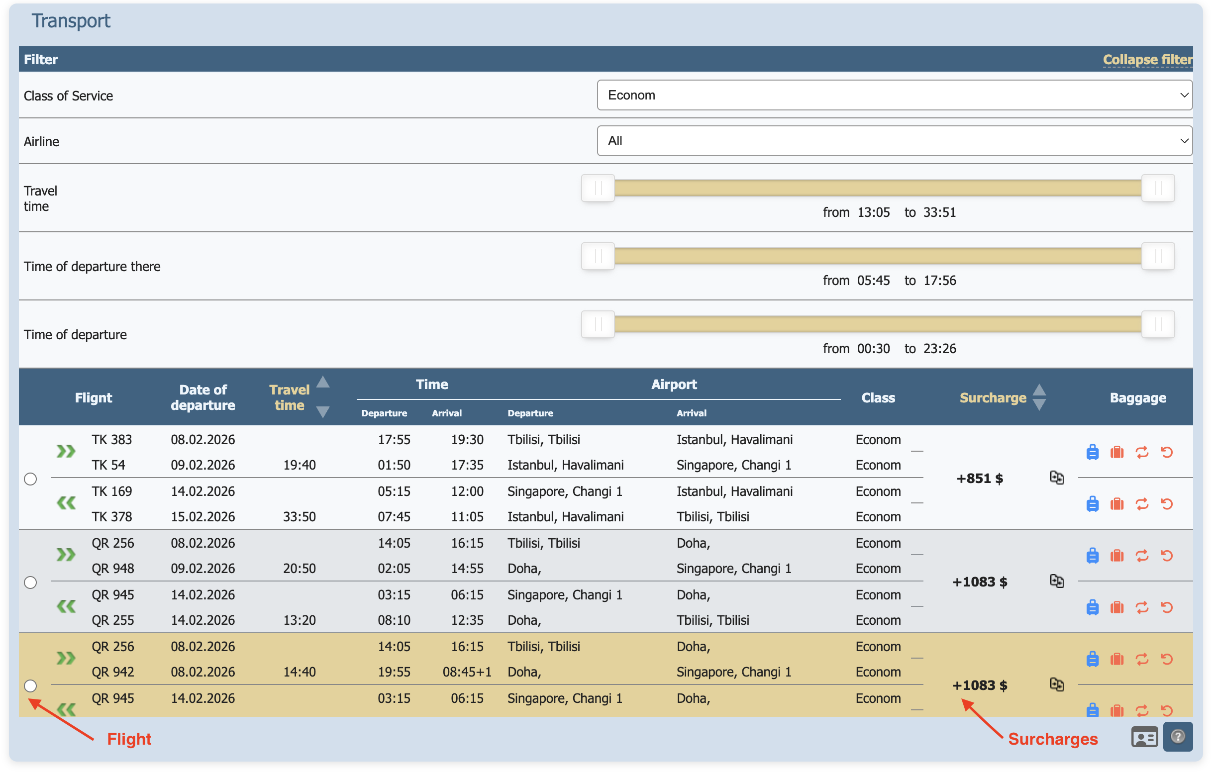 6. In this form, you can select a specific flight, service class, preferred flight time parameters, and see the surcharge for the selected flight: