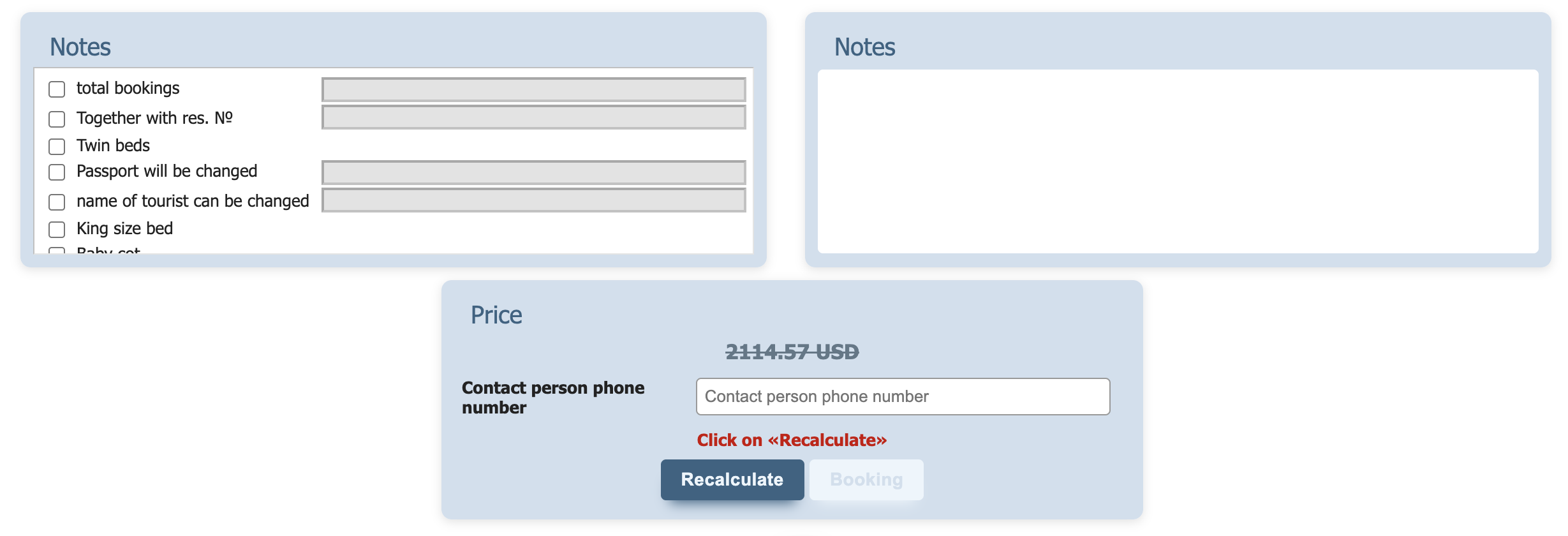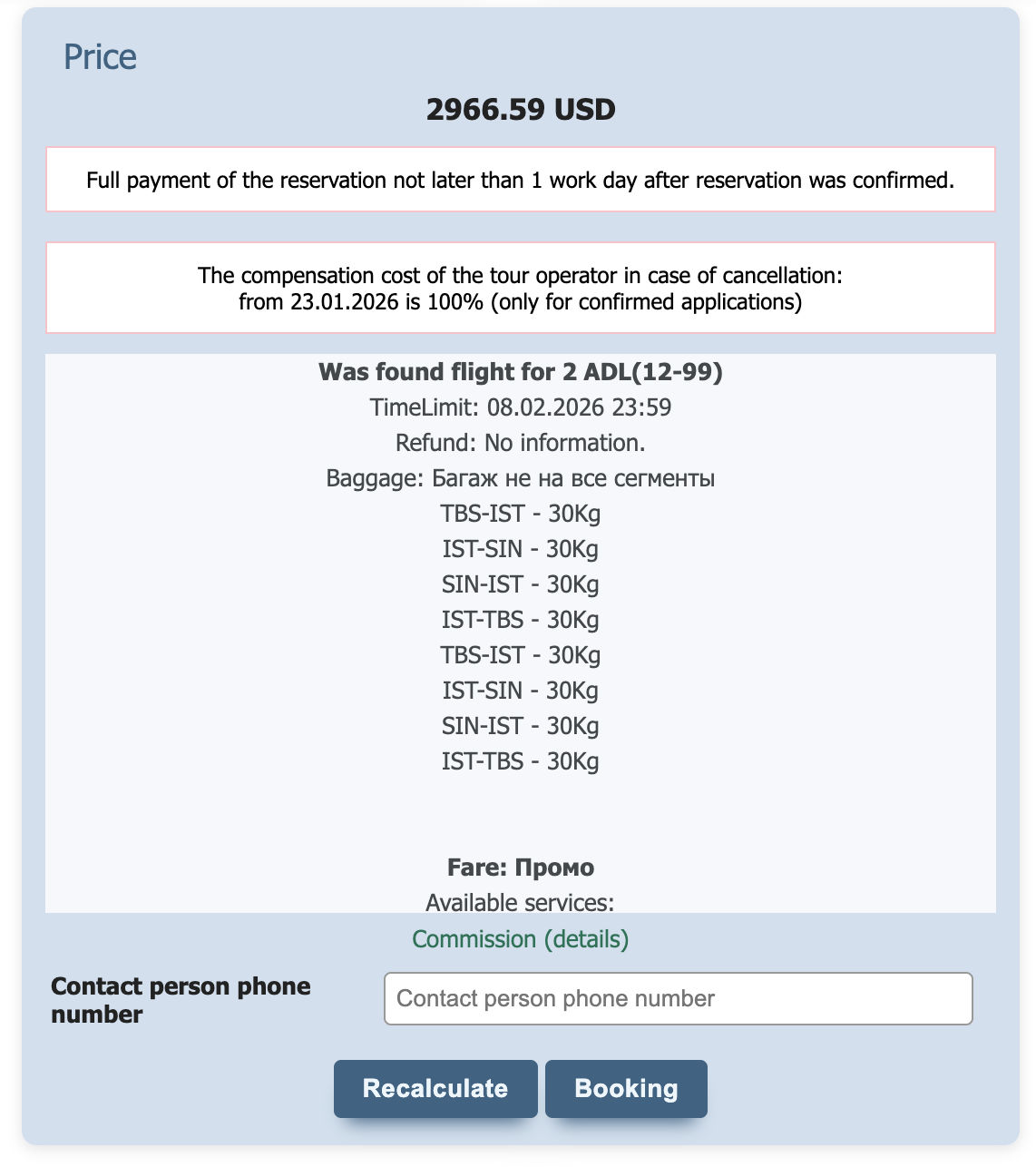 7. To display the final tour price (including the selected flight and additional services), click the “Recalculate” button at the bottom of the page (this can be done without entering passengers’ passport details).