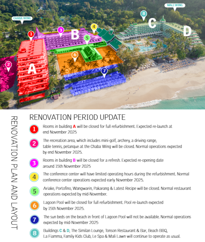 Важно! С 9 мая по 30 ноября 2025 года в отеле Le Méridien Phuket Beach Resort проходит этап реновации. В этот период часть инфраструктуры временно закрыта, однако основные удобства и сервисы остаются доступными для гостей.