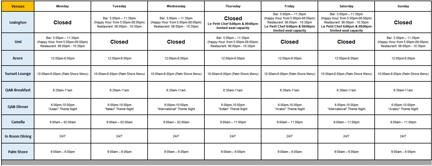 Начиная с 1 октября 2024 года запустилась новая концепция Al Hamra Dine Around. Гости, остановившиеся в Waldorf Astoria Ras Al Khaimah, теперь могут обедать в Sofitel Al Hamra Beach Resort или The Ritz-Carlton Al Hamra: >>