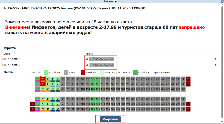 3. Открывается раскладка самолета с местами. Выбираем нужное место. Выбранные места обозначены бордовым цветом. Нажимаем «Сохранить»
