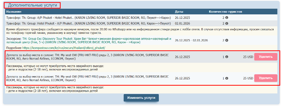 4. Перепроверяем сохранение мест в графе «Дополнительные услуги».