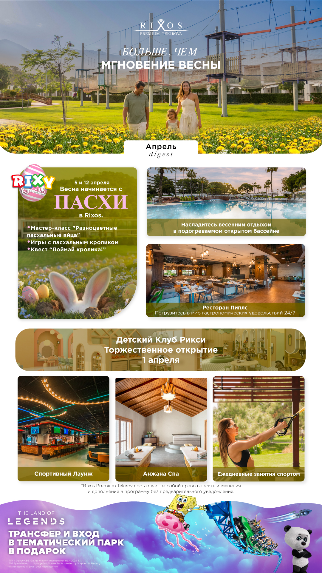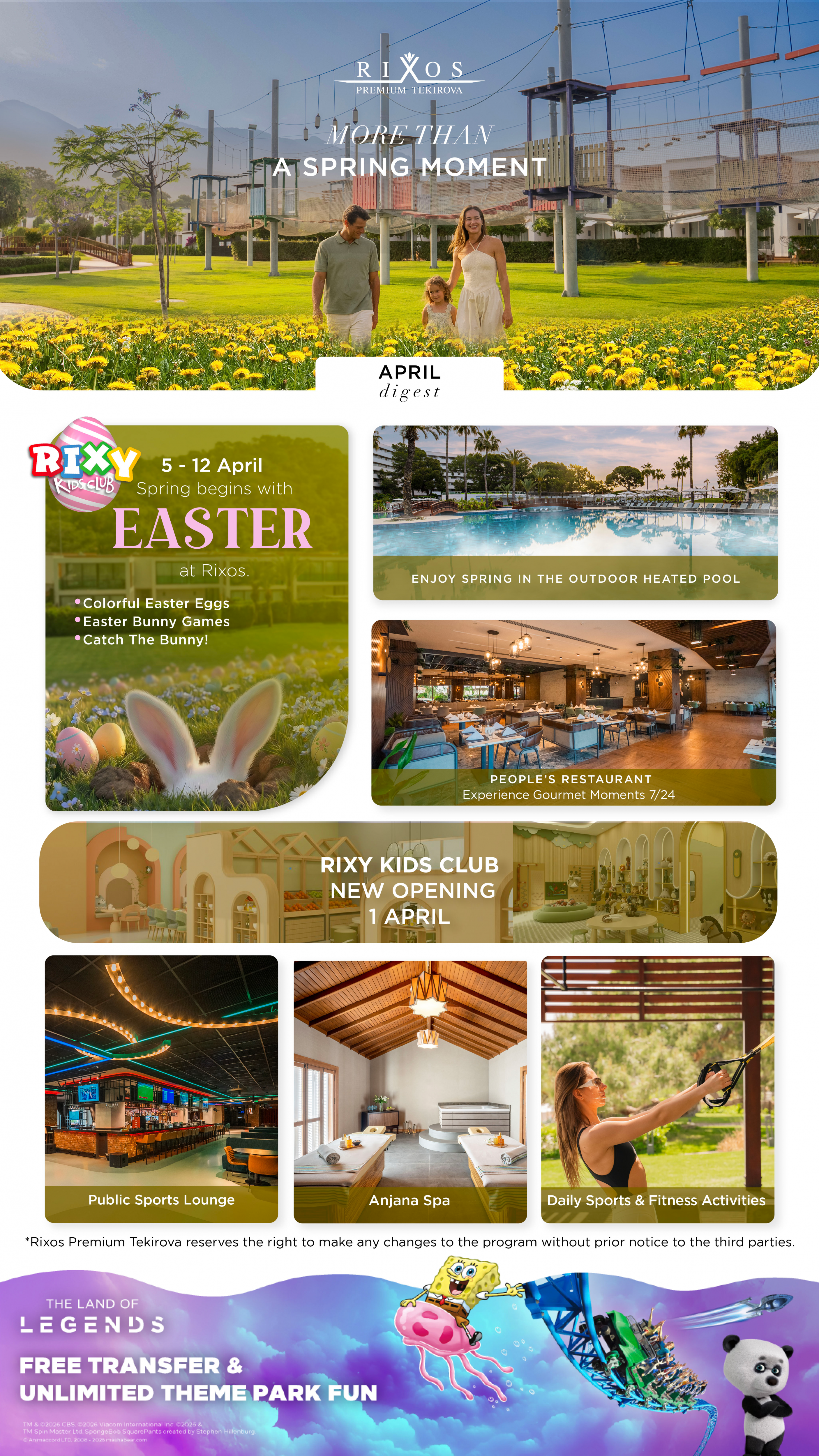 Күн сайын таңертең Тахталаның силуэті, Тавр тауларының ең керемет шыңы, Жерорта теңізінің тыныш суларына қарайтын Rixos Premium Tekirova-да көрінеді. Rixos Premium Tekirova қонақтарына табиғат аясында сәнді қызмет көрсететін ұмытылмас демалыс ұсынады. Қонақ үй "Бақытты бала – бақытты отбасы" тұжырымдамасын ұстанады, сондықтан Rixos Premium Tekirova барлық жастағы қонақтар үшін көптеген іс-шараларды ұсынады. Сонымен қатар, салауатты өмір салтын сақтау үшін қажет нәрсенің бәрі бар.
