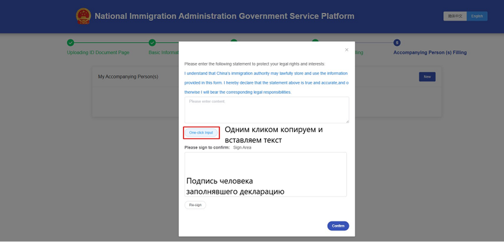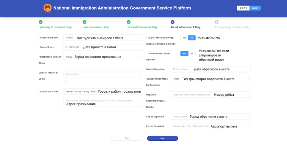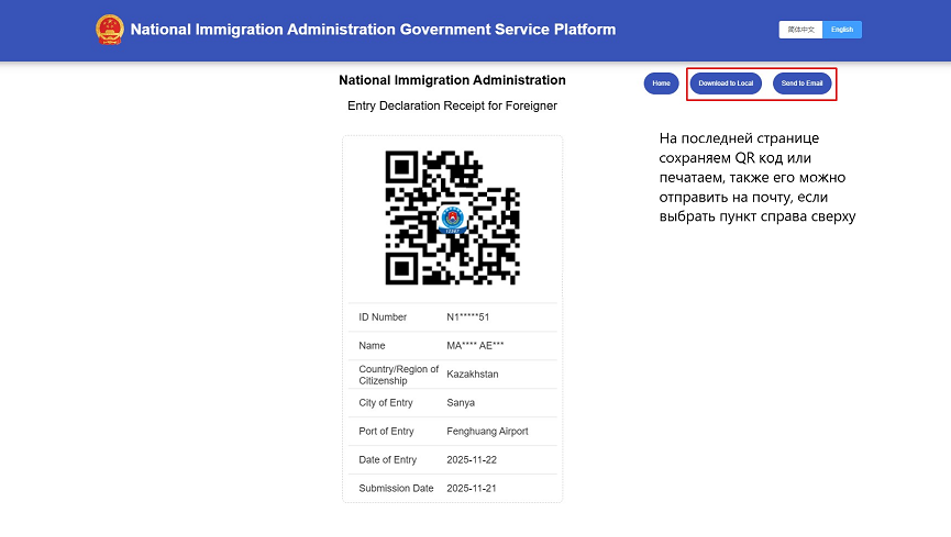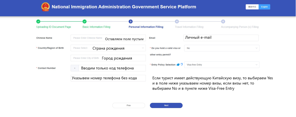 Заполнить карточку можно в день вылета: на стойке регистрации отсканировать QR код «Entry Card» камерой смартфона или через приложения WeChat/Alipay, либо перейти на официальный портал миграционной службы КНР https://s.nia.gov.cn/ArrivalCardFillingPC/entry-registation-home и ввести персональные данные, цель поездки и данные паспорта.