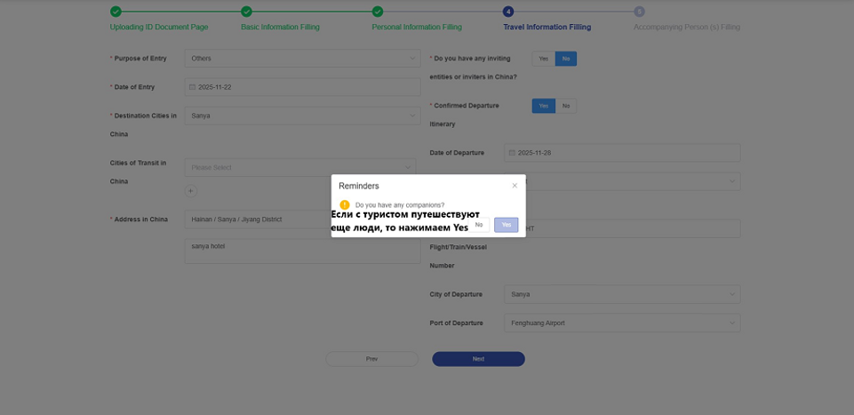 ШАГ 7. ЕСЛИ С ТУРИСТОМ ПУТЕШЕСТВУЮТ ДРУГИЕ ТУРИСТЫ, НАЖАТЬ YES И ДОБАВИТЬ ОСТАЛЬНЫХ ТУРИСТОВ: