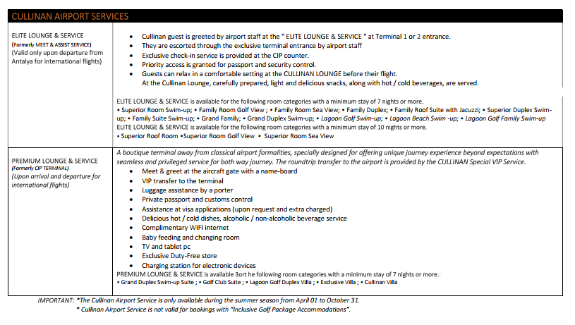 Готель, що спроєктований з урахуванням екологічної архітектури й знаходиться в повній гармонії з природою, виділяється заспокійливими душу і надають стильності дизайну інтер'єру помаранчевими тонами, зображають атмосферу Середземномор'я. Cullinan Golf & Resort Belek межує з наймальовничішим і найдовшим узбережжям Анталії Белек, який є справжнім туристичним раєм.