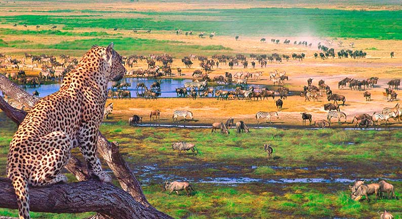 Огромные стада антилоп, зебр, газелей и других копытных осенью и весной мигрируют по равнине, на них охотятся прайды львов, гепарды и леопарды-одиночки, а также более мелкие хищники. У озер прогуливаются слоны и буйволы, жирафы и гиппопотамы, а в реках полно крокодилов.